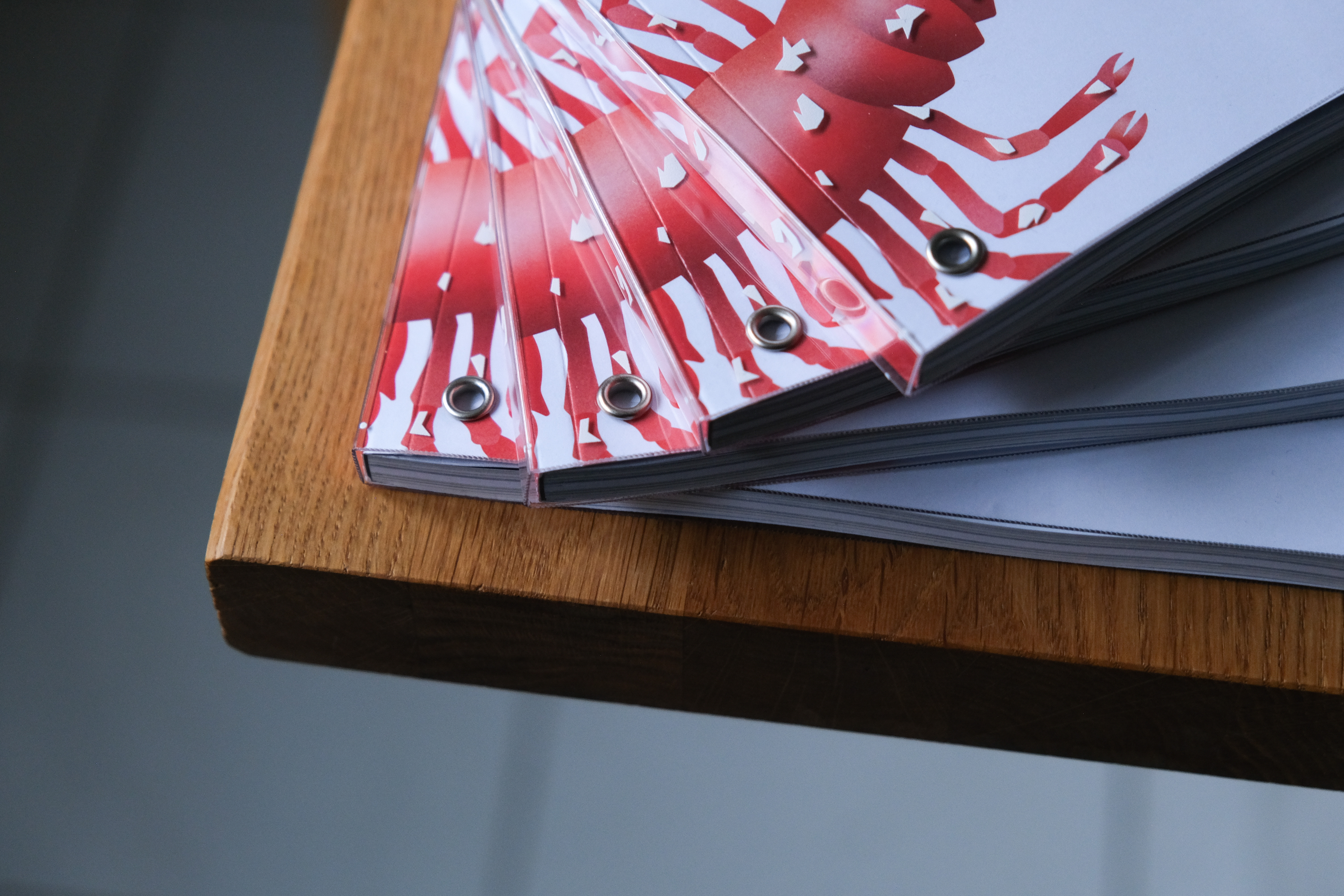 Der Umschlag ist nur auf der Rückseite befestigt. Dafür nutzten wir silberne Ösen in jeder Ecke. Dadurch lässt sich der transparente nicht entfernen aber trotzdem aufschlagen.