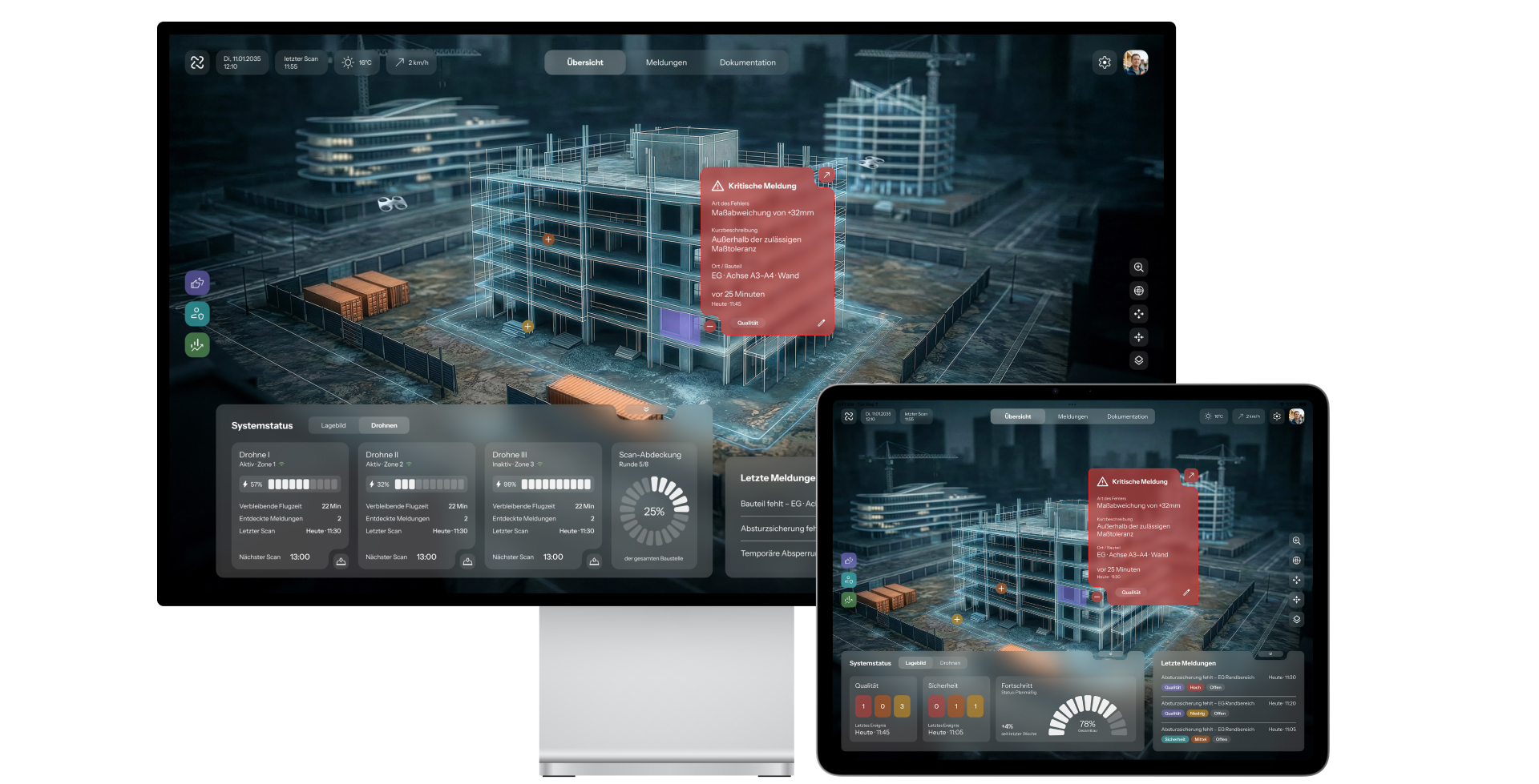 Alle von den Drohnen erfassten Daten werden in einem zentralen Dashboard gebündelt und strukturiert dargestellt. So entsteht ein aktuelles Lagebild der Baustelle, das Fortschritt, Abweichungen und sicherheitsrelevante Veränderungen sichtbar macht. Der Ist-Zustand wird mit der Planung abgeglichen und im BIM-Modell verortet. Die Bauleitung behält so den Überblick über alle relevanten Informationen an einem.