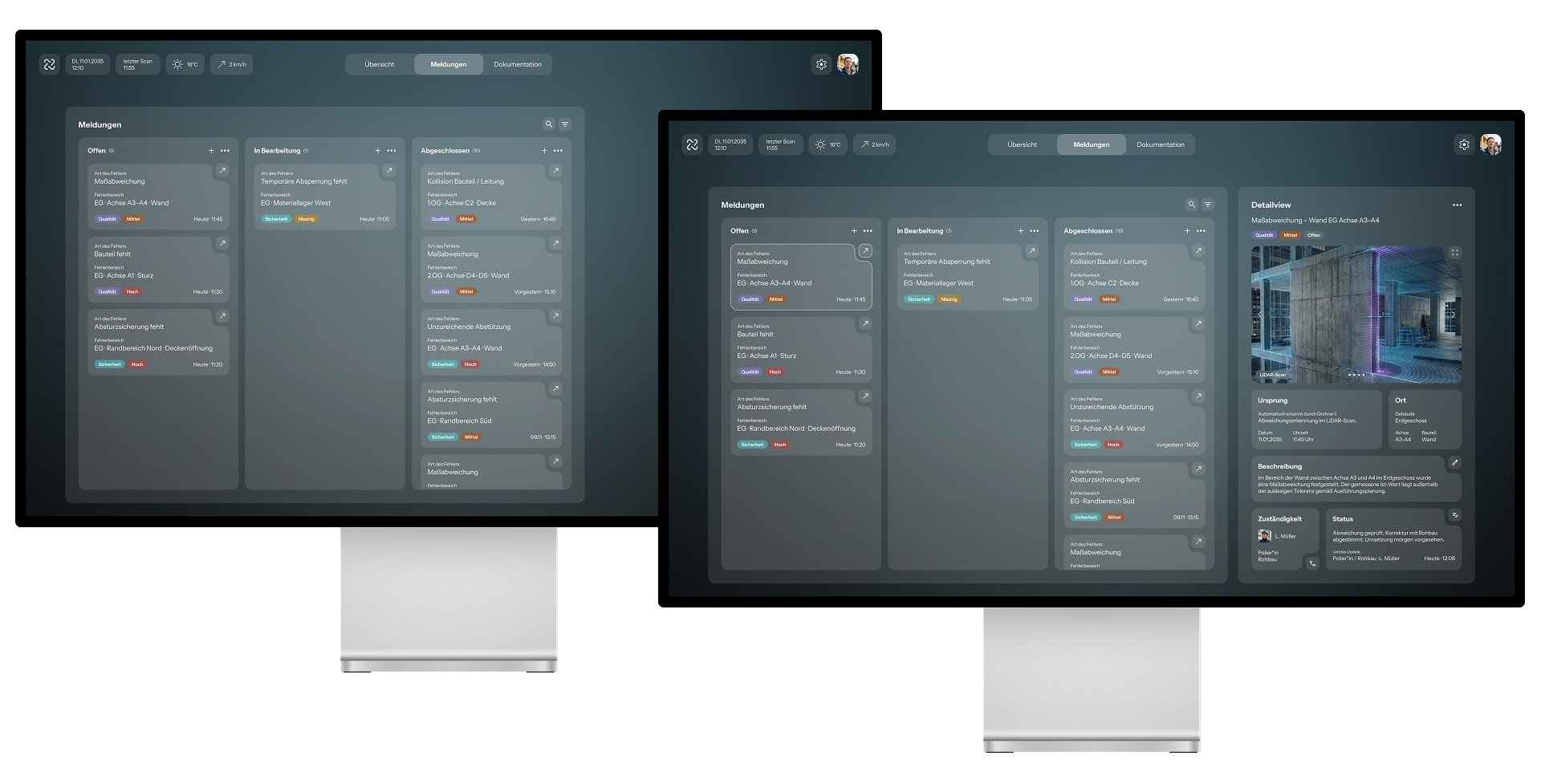 Im Bereich Meldungen werden alle Abweichungen gesammelt und übersichtlich dargestellt. Sie lassen sich priorisieren, bearbeiten und im Verlauf nachverfolgen. Jede Meldung bündelt die relevanten Informationen wie Aufnahmen, Ort und Zuständigkeit. So bleibt der Umgang mit Abweichungen für alle Beteiligten klar und nachvollziehbar.