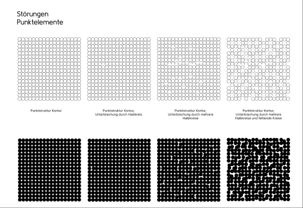 Im Kurs Programmiertes Entwerfen 1 werden grundlegende gestalterische Repertoires zur systematischen Organisation von visuellen Zeichenbeziehungen sowie visueller Phänomene untersucht, gesammelt und in Prozessschritten dokumentiert.