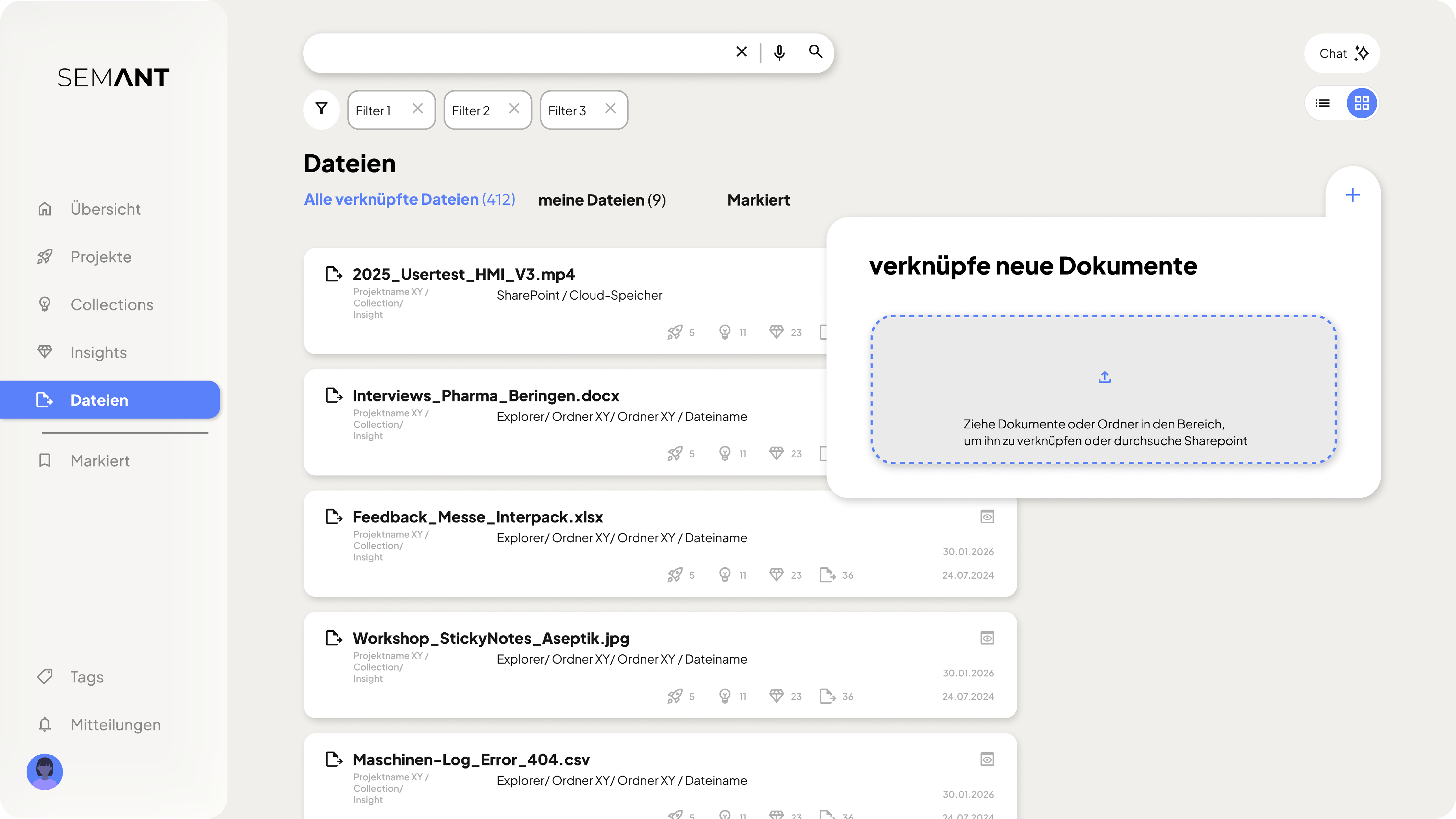 SEMANT ist eine KI gestützte Plattform, die verteiltes, kollektives Wissen in ein semantisches Netzwerk überführt. Anstatt Daten mühsam neu anzulegen, dient SEMANT als Schnittstellen-Plattform, die bestehende Dokumente via Drag-and-drop verknüpft. Sie dient als intelligenter Overlay über die vorhandenen Dokumente und strukturiert sie neu, um sie für mehr Mitarbeitende transparent zur Verfügung zu stellt.