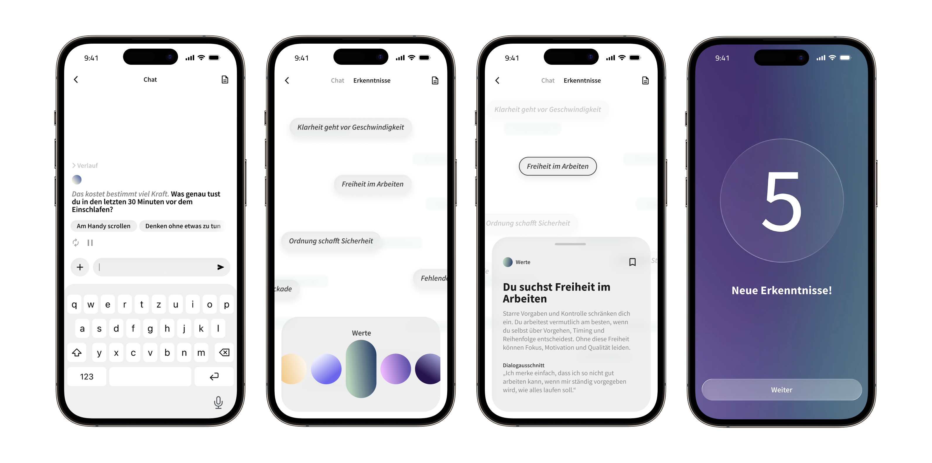 Dabei werden auch Muster, Widersprüche oder Schwerpunkte sichtbar, die im eigenen Denken leicht übersehen werden. Jede neue Erkenntnis vergrößert die Sammlung und macht Entwicklung sichtbar. Per Zoom oder Wischen können die Ebenen navigiert werden, und durch Antippen einer Erkenntnis öffnet sich eine Detailansicht mit den relevanten Dialogausschnitten sowie einer Einordnung.