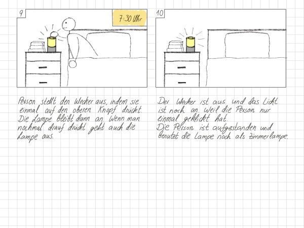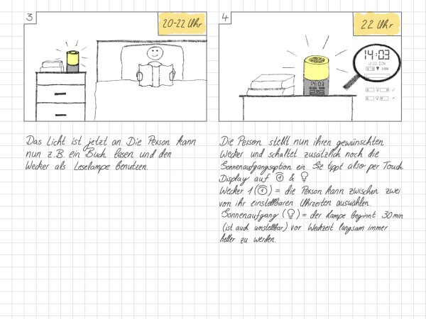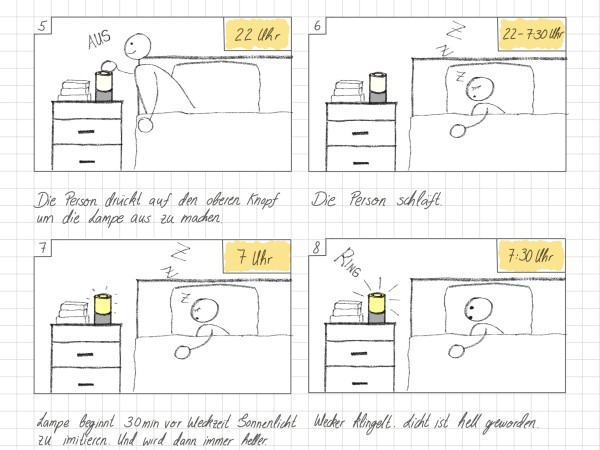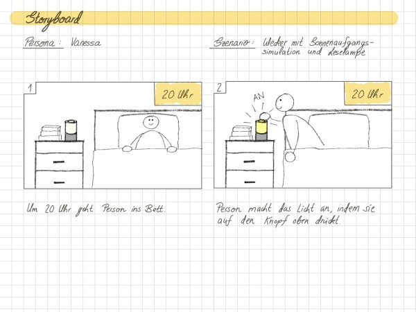 Als Grundlage diente ein Interview mit Vanessa. Sie hat einen regelmäßigen Schlafrhythmus und benötigt keinen aggressiven Wecker. Stattdessen nutzt sie morgens bewusst natürliches Licht und liest abends oft im Bett. Daraus entstand die Idee, einen Wecker zu entwickeln, der sowohl sanft weckt als auch als angenehmes Leselicht dient.