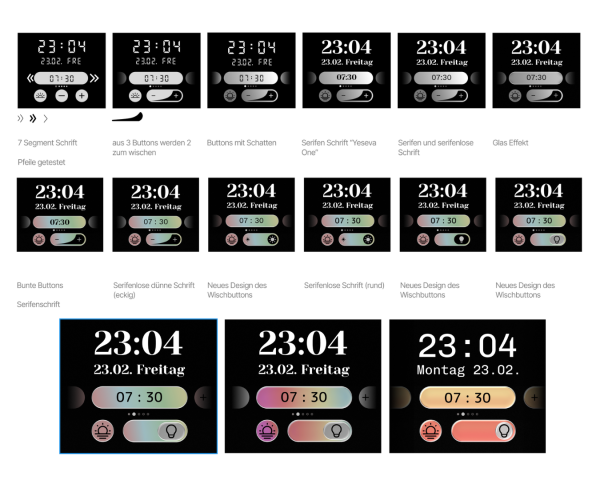 In der Skizzenphase wurden zunächst unterschiedliche Grundformen erprobt. Anschließend folgten Varianten mit Display, Bedienung und Interaktionen. Dabei entwickelte sich die Gestaltung von klassischen Knöpfen hin zu einer reduzierten, intuitiven Touch-Bedienung. Die weiteren Schritte umfassten die Ausarbeitung des Displays, der Interaktion, der Bedienelemente sowie des Farb- und Lichtkonzepts.