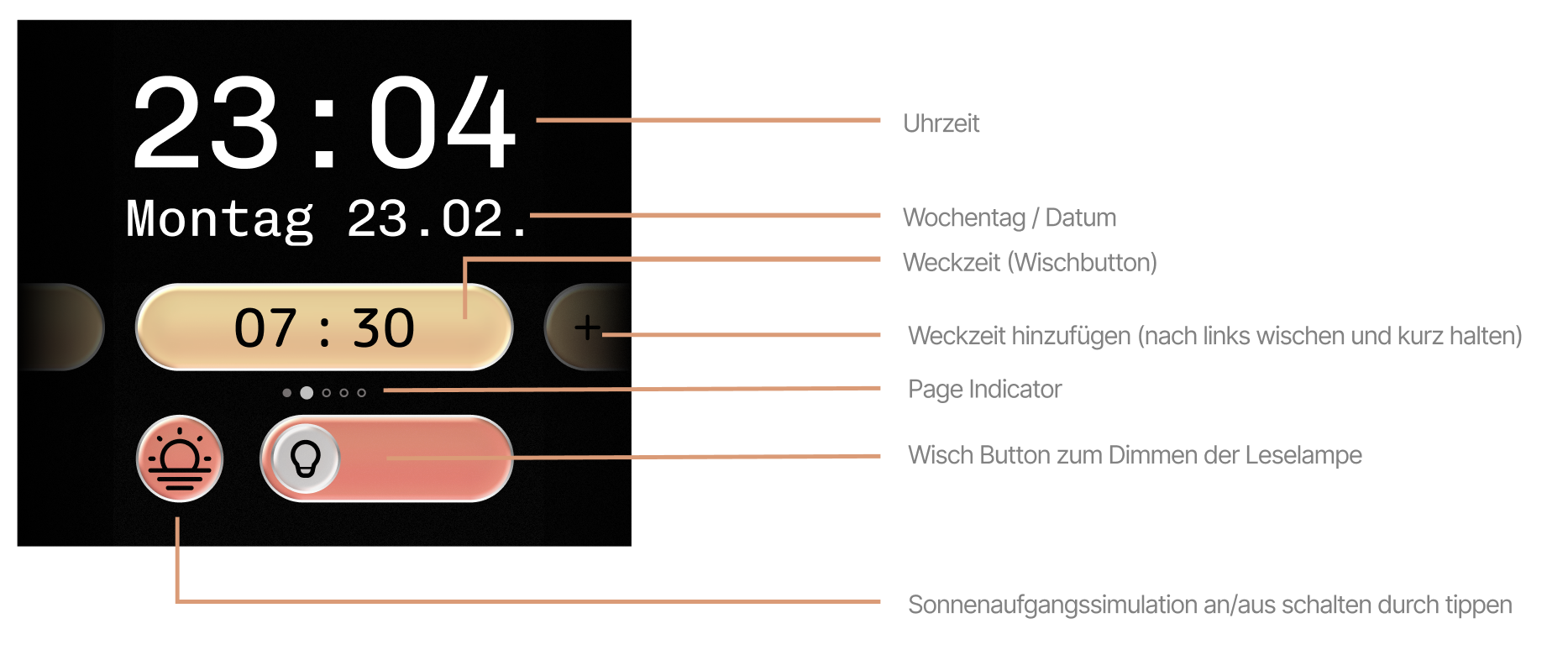 Die wichtigsten Bedürfnisse waren ein natürliches Aufwachen, einfache Bedienung und eine ruhige Atmosphäre. Deshalb simuliert der Wecker etwa 20 Minuten vor der Weckzeit einen Sonnenaufgang – von warmem Rot bis zu hellem Morgenlicht. Gleichzeitig kann das Licht abends als warme Lesebeleuchtung genutzt werden. Eine runde, weiche Form und wenige intuitive Bedienelemente unterstützen die ruhige Nutzung.