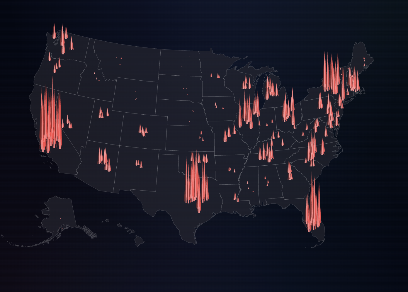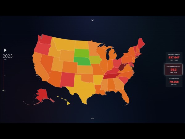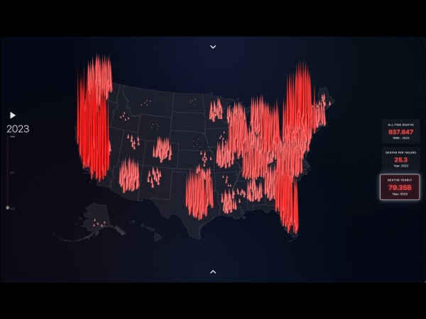 Unser Ziel war es, die Entwicklung der drogenbedingten Todesfälle von 1999 bis 2023 über alle 50 Bundesstaaten hinweg darzustellen. Dafür entschieden wir uns für eine interaktive Karte der USA als mit drei Ebenen: