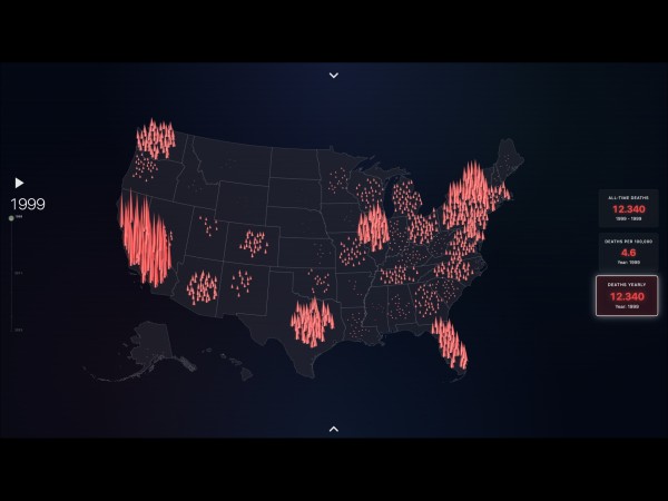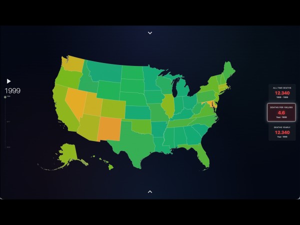 Hier wird wird die Sterberate pro 100 000 dargestellt, also wieviel Menschen aus einer Gruppe von 100 000 Menschen an einem Drogentod stirbt, genauer gesagt an einer Überdosis mit Opioiden. Je höher die Zahl, desto roter der Bundesstaat. Es ist verblüffend wie hoch manche dieser Zahlen sind, wenn man sie vergleicht mit der Sterberate bei z.B. Auto-Unfällen.