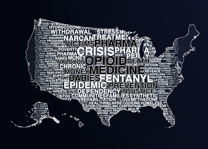 Die Zahlen sind zwar schrecklich hoch und schockieren, aber es fehlt Kontext, um wirklich das Gefühl zu haben, weitreichend informiert zu werden. Das Konzept der Word Cloud fanden wir sehr interessant, und konnten schließlich eine Kombination aus kartografischer Datenvisualisierung und zusätzlicher kontextueller Ebene erstellen. Diese dritte Ebene ist eine weitere Karte der USA, beinhaltet aber eine Ansammlung zentraler Begriffe rund um das Thema Opioide wie z.B. Sucht, OxyContin, Naloxon, Big Pharma und Lobbyismus.