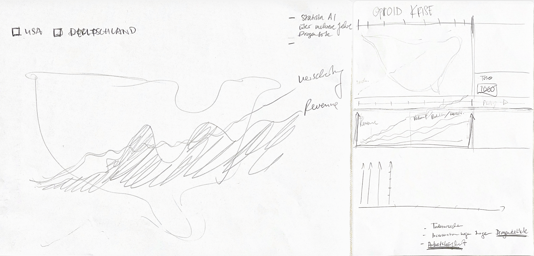 Während der Konzeptphase beschäftigten wir uns intensiv mit möglichen Darstellungsformen. In mehreren Runden fertigten wir Skizzen und Zeichnungen an, testeten unterschiedliche Metaphern und Bildideen und diskutierten deren Wirkung. Die Darstellung sollte nicht nur informieren, sondern auch erschüttern, und ein Gefühl der Dringlichkeit hervorrufen.