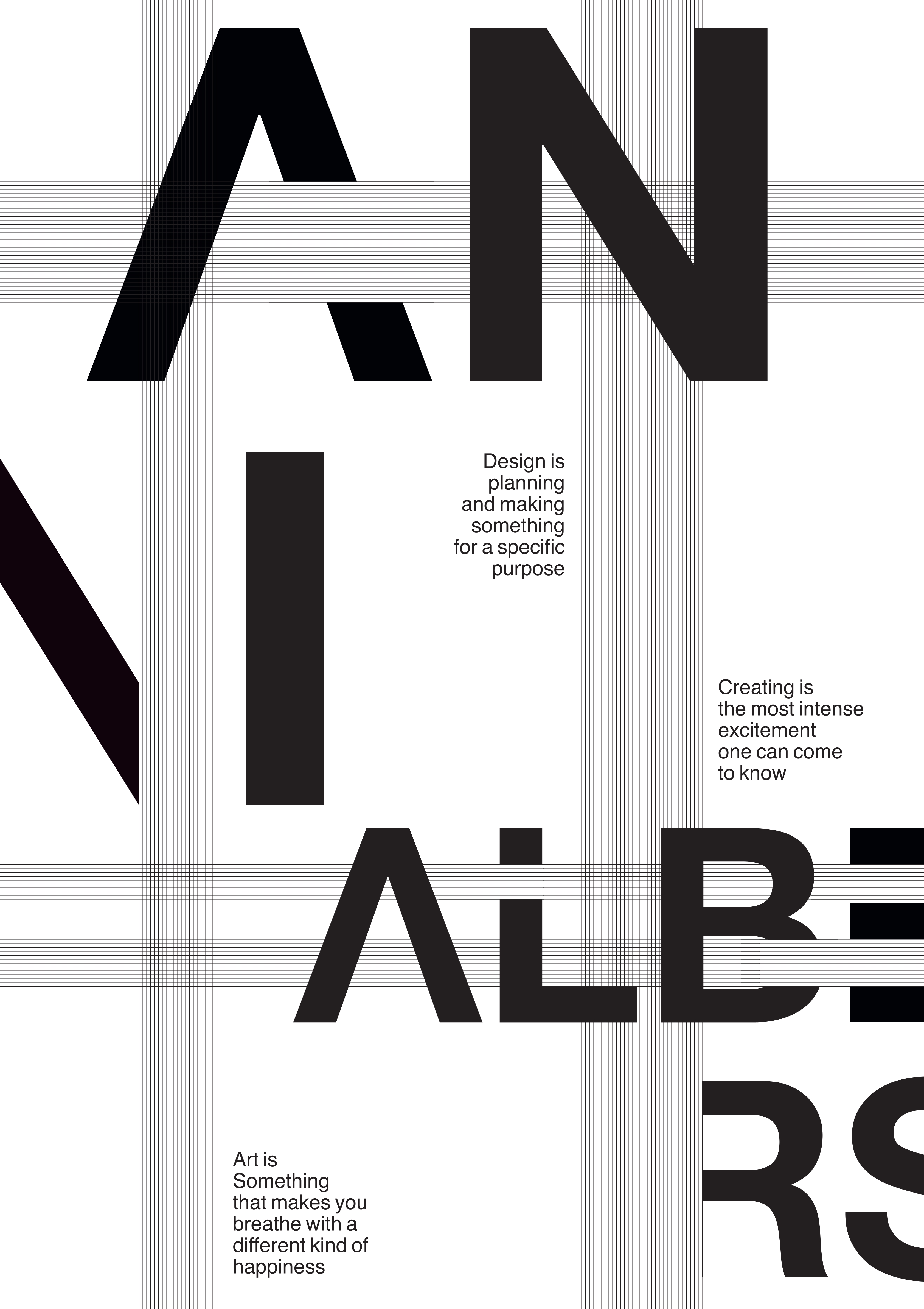 Das Fach Grundlagen der Typografie führt in die mikro- und makroästhetischen Grundlagen der Arbeit mit Schrift ein. Ausgehend vom einzelnen Buchstaben, der kleinsten typografischen Einheit, bis hin zu komplexeren Layoutentwürfen wird der Umgang mit Schrift erarbeitet. In unterschiedlichen Übungen werden formale Fragestellungen zu Form, Gegenform, Proportion, Kontrast oder Rhythmus im Bezug auf die Anwendung und Wirkung unterschiedlicher Schriften von den Studenten und Studentinnen untersucht und besprochen. Im Rahmen eines Kurzprojekts erkunden sie die Möglichkeiten der Typografie als Werkzeug zur Gliederung, Gewichtung und Strukturierung von Informationen.