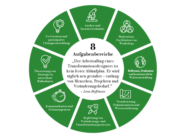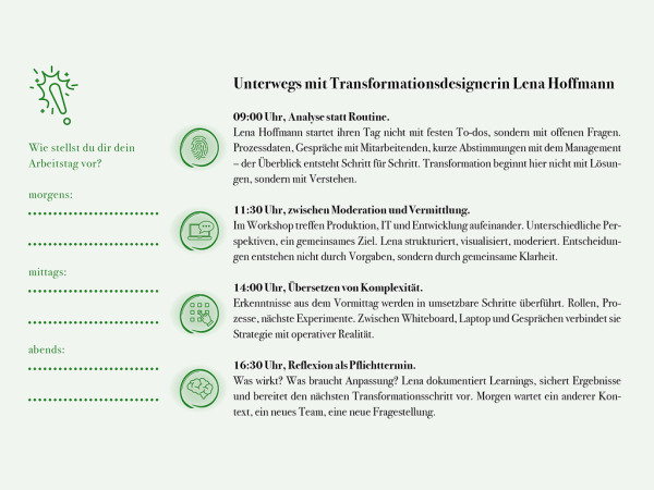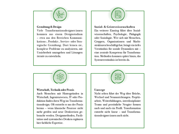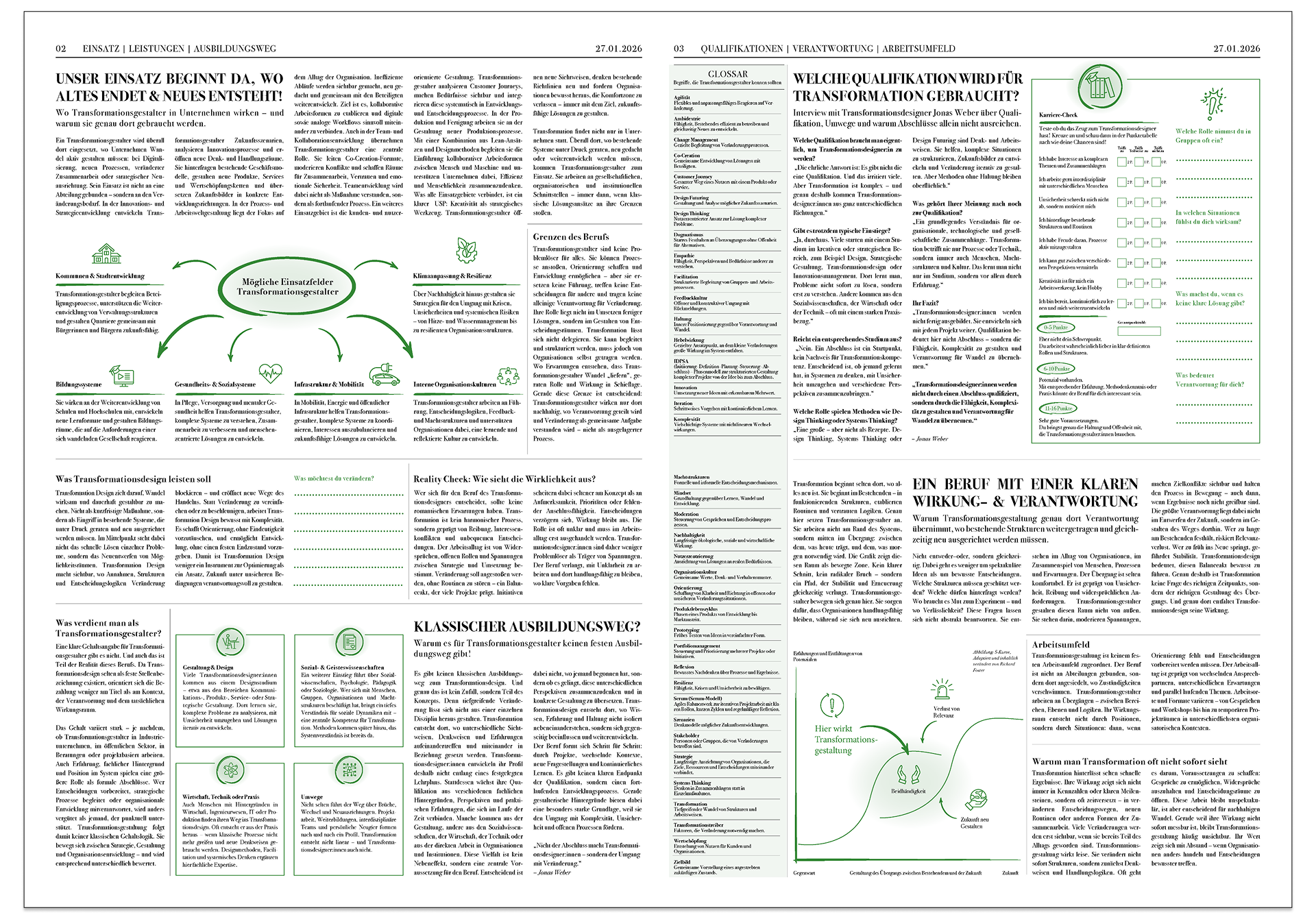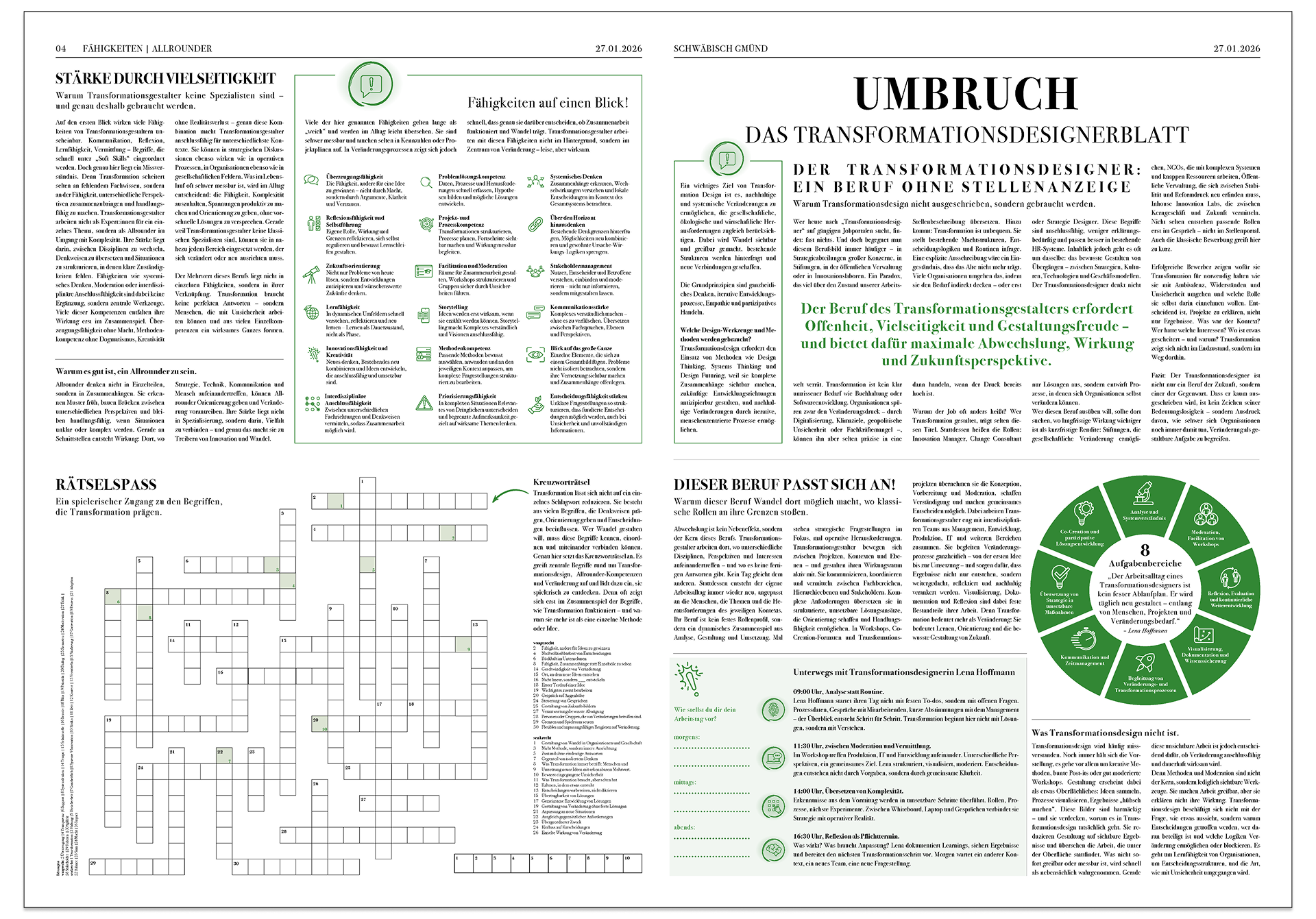 Die Zeitung vermittelt nicht nur klassische Inhalte wie Qualifikationen, Einstiegsmöglichkeiten, Aufgabenbereiche und Fähigkeiten, sondern zeigt auch den abwechslungsreichen Alltag eines Transformationsdesigners, was der Beruf nicht umfasst und wo seine Grenzen liegen.