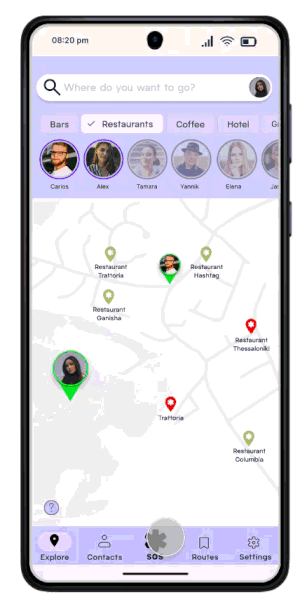 The most important feature: the SOS button, by clicking it, it instantly shares your location with authorities and chosen contacts for immediate help.