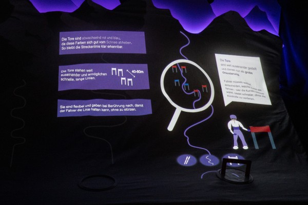 Die inhaltliche Führung übernimmt ein Skitrainer, der als erzählerisches Element durch die Ausstellung leitet. Er erklärt die jeweiligen Besonderheiten und Fokusbereiche der einzelnen Disziplinen und schafft so einen klaren roten Faden, der die Besucher Schritt für Schritt durch die Inhalte führt.