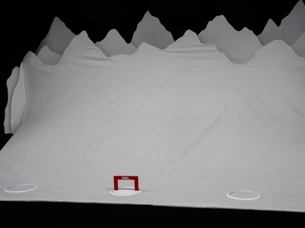 Das Ausstellungsmodell besteht aus einer Bergsilhouette, die mit einem Stoff bespannt ist und als Projektionsfläche dient. Dadurch entsteht eine räumliche Verbindung zum alpinen Kontext. Die technische Umsetzung basiert auf einem Arduino-Board, das die interaktiven Elemente steuert und die Verbindung zwischen Modell, Projektion und Nutzerinteraktion ermöglicht.
