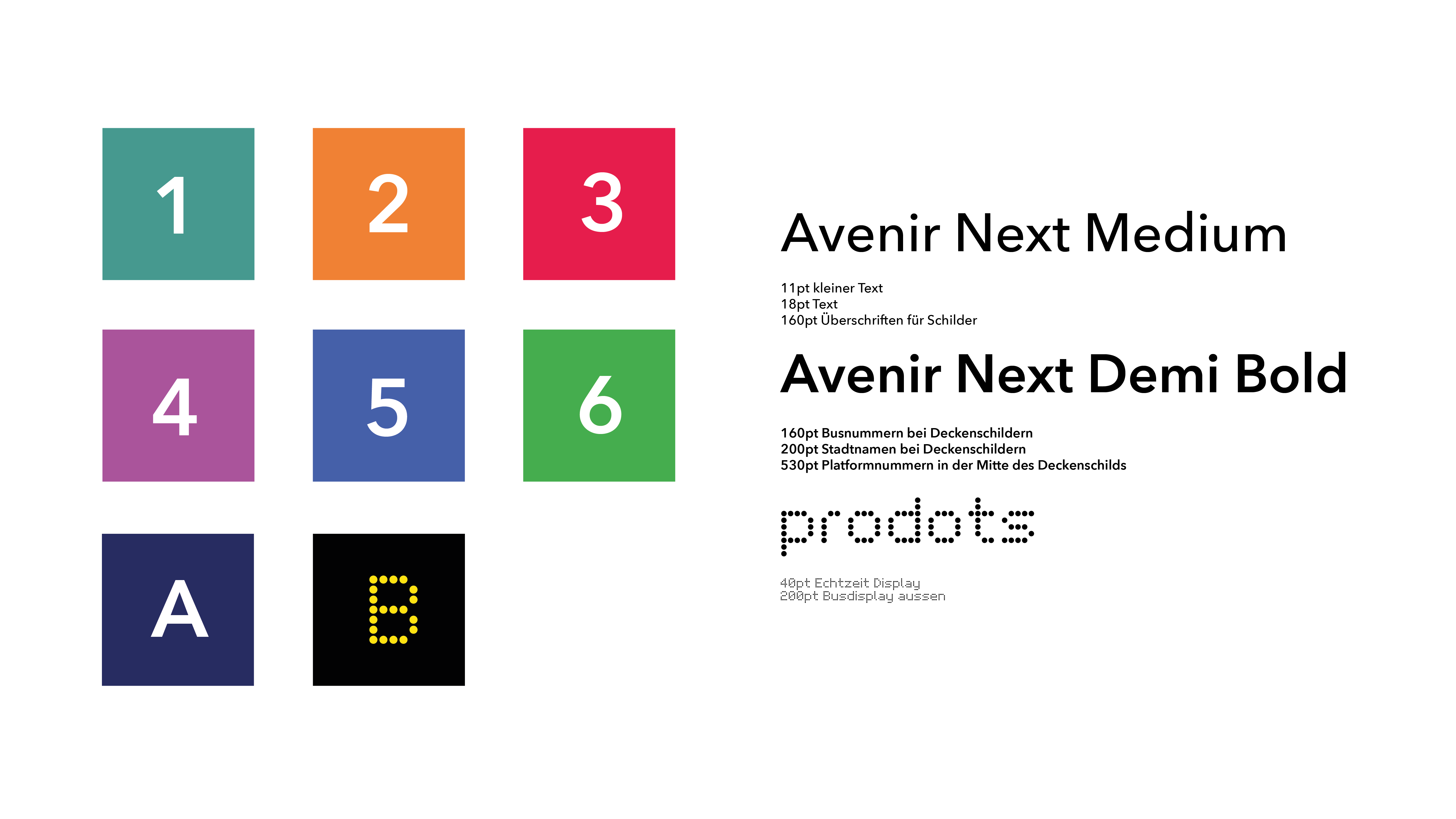 Für Headlines und Fließtext kommt die Avenir Next (Medium & Bold) zum Einsatz. Die Echtzeit-Displays nutzen die Schrift Proton, passend zu den Piktogrammen.