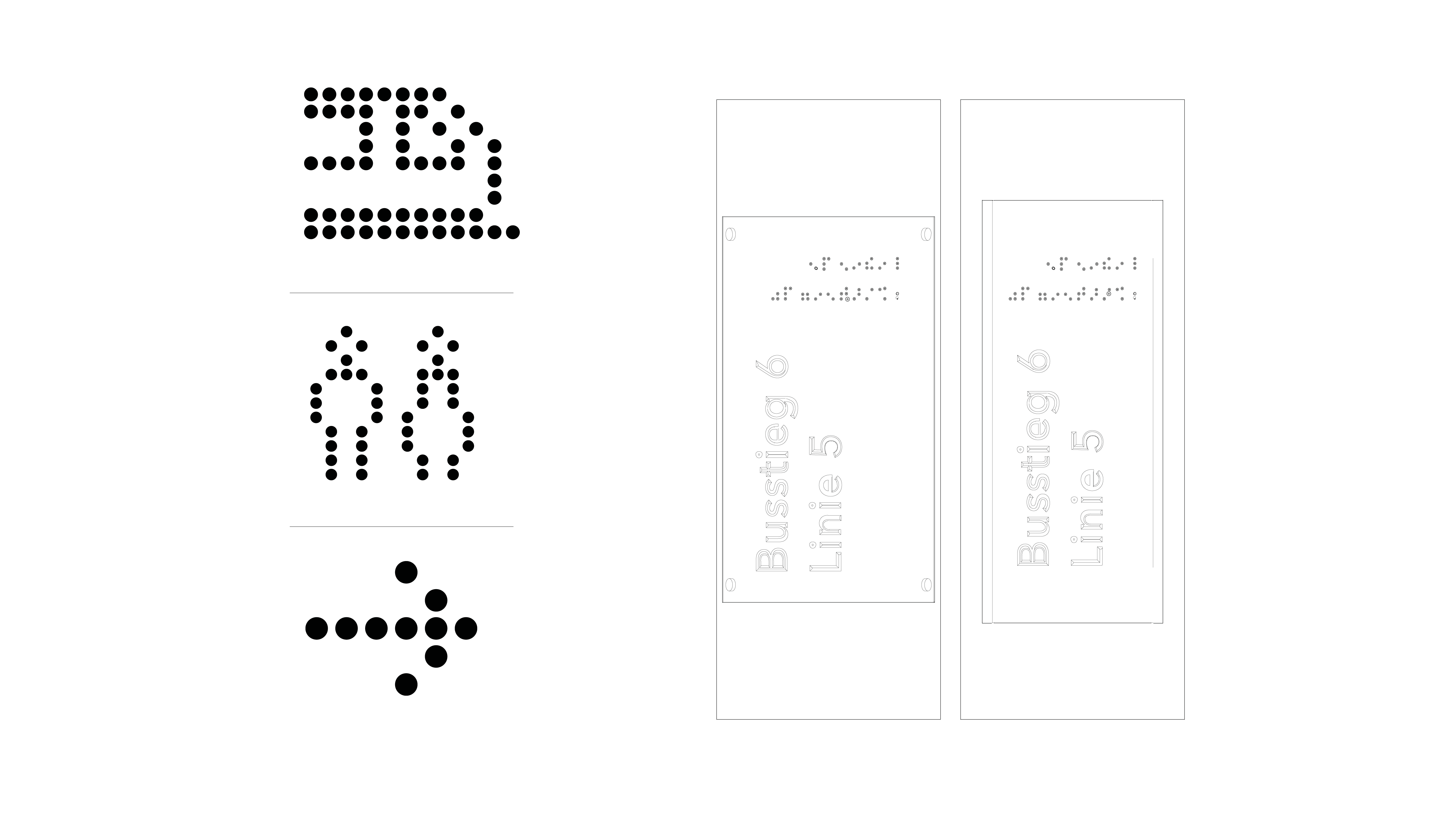 Die Schildergestelle an den Haltestellen verfügen über taktile Elemente mit Braille- und gut lesbarer Standardschrift. Sie vermitteln zentrale Informationen wie Busnummer und zugehörige Plattform und machen diese barrierefrei für unterschiedliche Nutzergruppen zugänglich.
