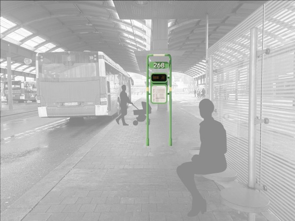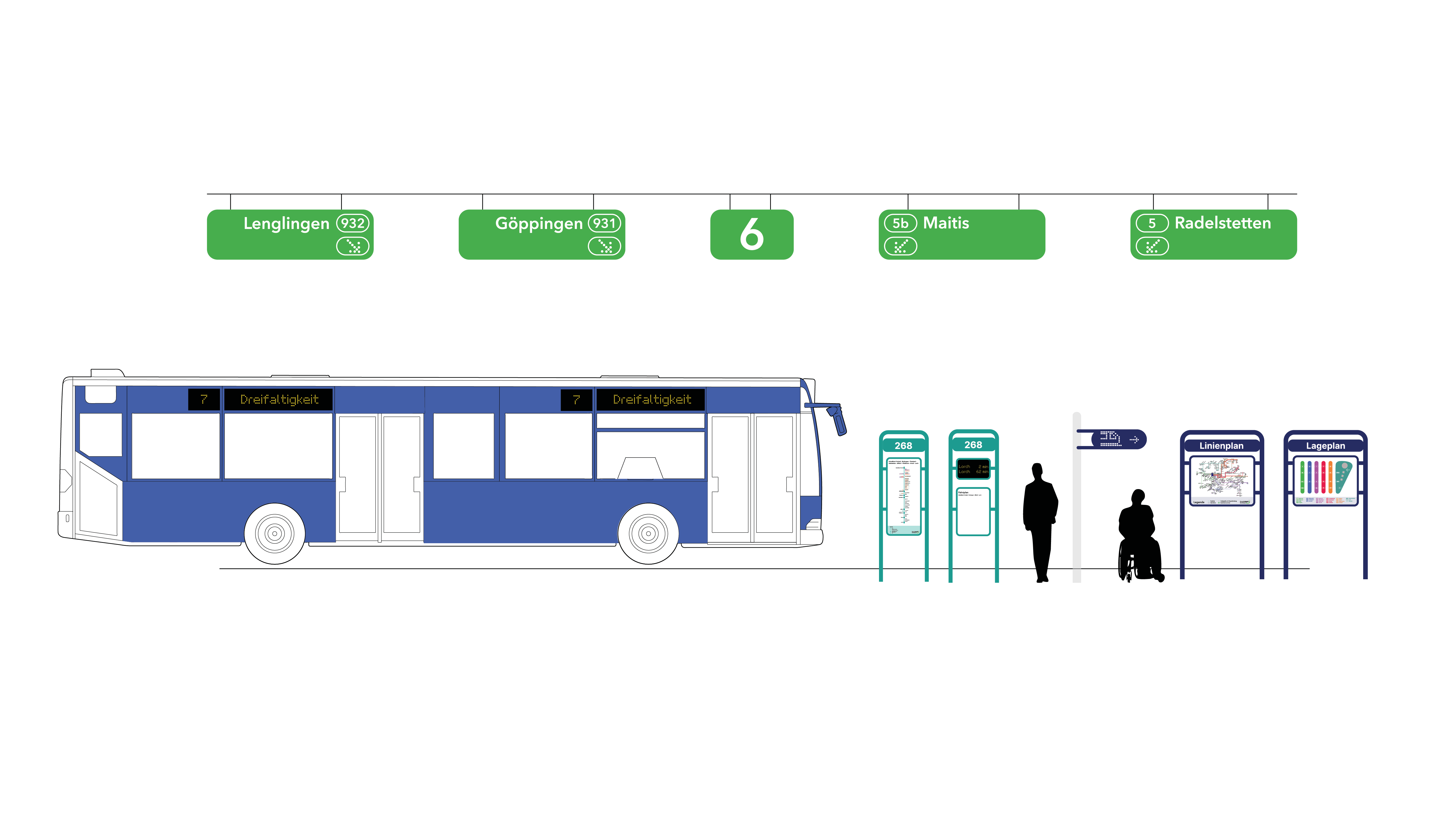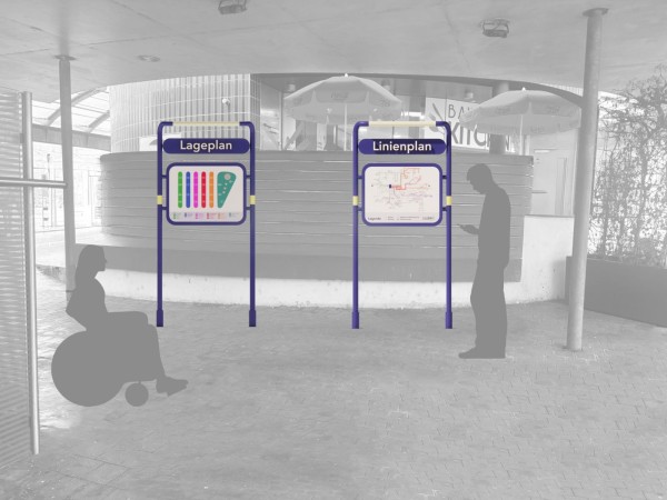 Die Schildergestelle an den Haltestellen verfügen über taktile Elemente mit Braille- und gut lesbarer Standardschrift. Sie vermitteln zentrale Informationen wie Busnummer und zugehörige Plattform und machen diese barrierefrei für unterschiedliche Nutzergruppen zugänglich.