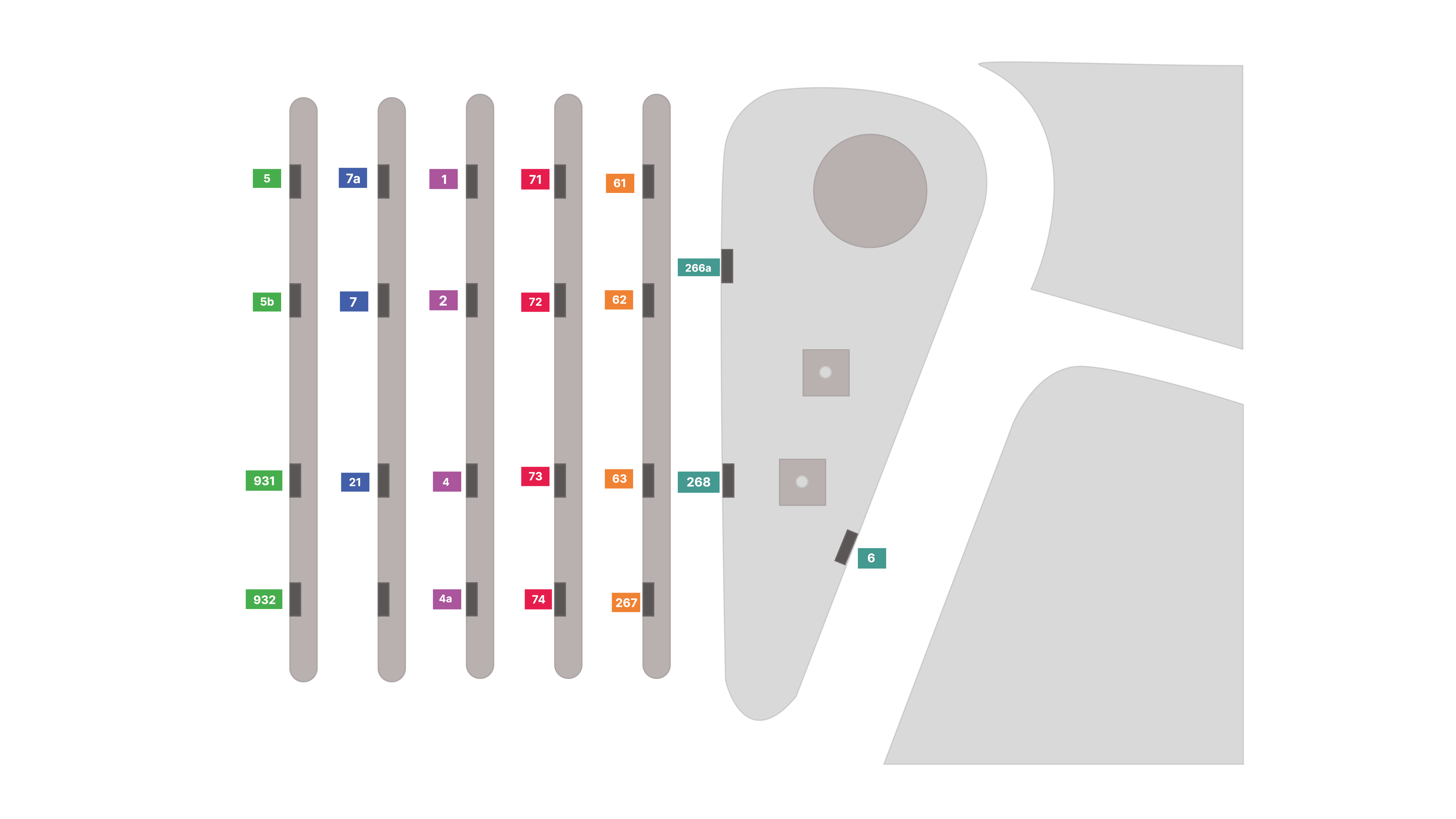 Die Beschilderung dient der Orientierung auf dem gesamten Gelände: plattformunabhängige Lagepläne markieren Wege mit hohem Personenaufkommen, etwa zum Bahnhof, während Boden-, Decken- und Busbeschilderung den jeweiligen Plattformen zugeordnet und einheitlich farblich gestaltet sind, um klare visuelle Verbindungen zu schaffen.